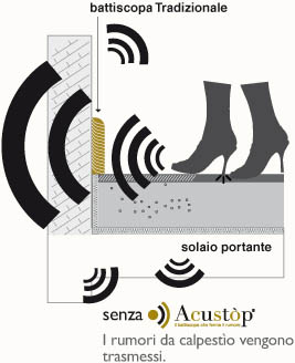 Acustòp® è un battiscopa in legno con una specifica guarnizione di gomma resiliente, inserita nella parte inferiore. Grazie alla sua elasticità riesce a compensare tutte le imperfezioni del pavimento. La guarnizione evita il contatto rigido tra le superfici riducendo notevolmente la trasmissione delle vibrazioni. In questa maniera viene evitato uno dei tipici errori di posa che determinano un aumento del livello di rumore da calpestìo nell’ambiente sottostante. La presenza della guarnizione tra il battiscopa e la pavimentazione elimina questo tipo di percorso di trasmissione, mantenendo inalterate le prestazioni del pavimento galleggiante.